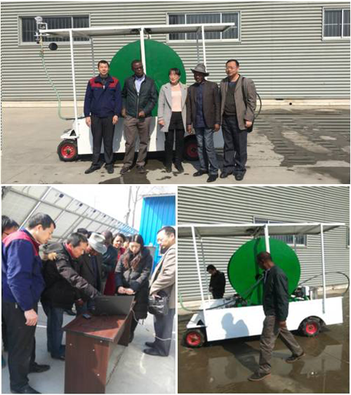 2016年年初,为了充分利用CCS太阳能磨面站富余的能量,根椐赞比亚ZCF提出的技术要求,天目团队发明了一台多功能智能喷灌小车,并于3月中旬在山东德建演示。